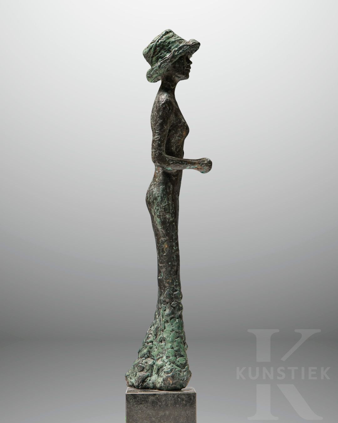 Een prachtig Groen/grijs gepatineerd bronzen beeld van een dame met hoed, staande op een rechthoekige zwarte granieten sokkel.
