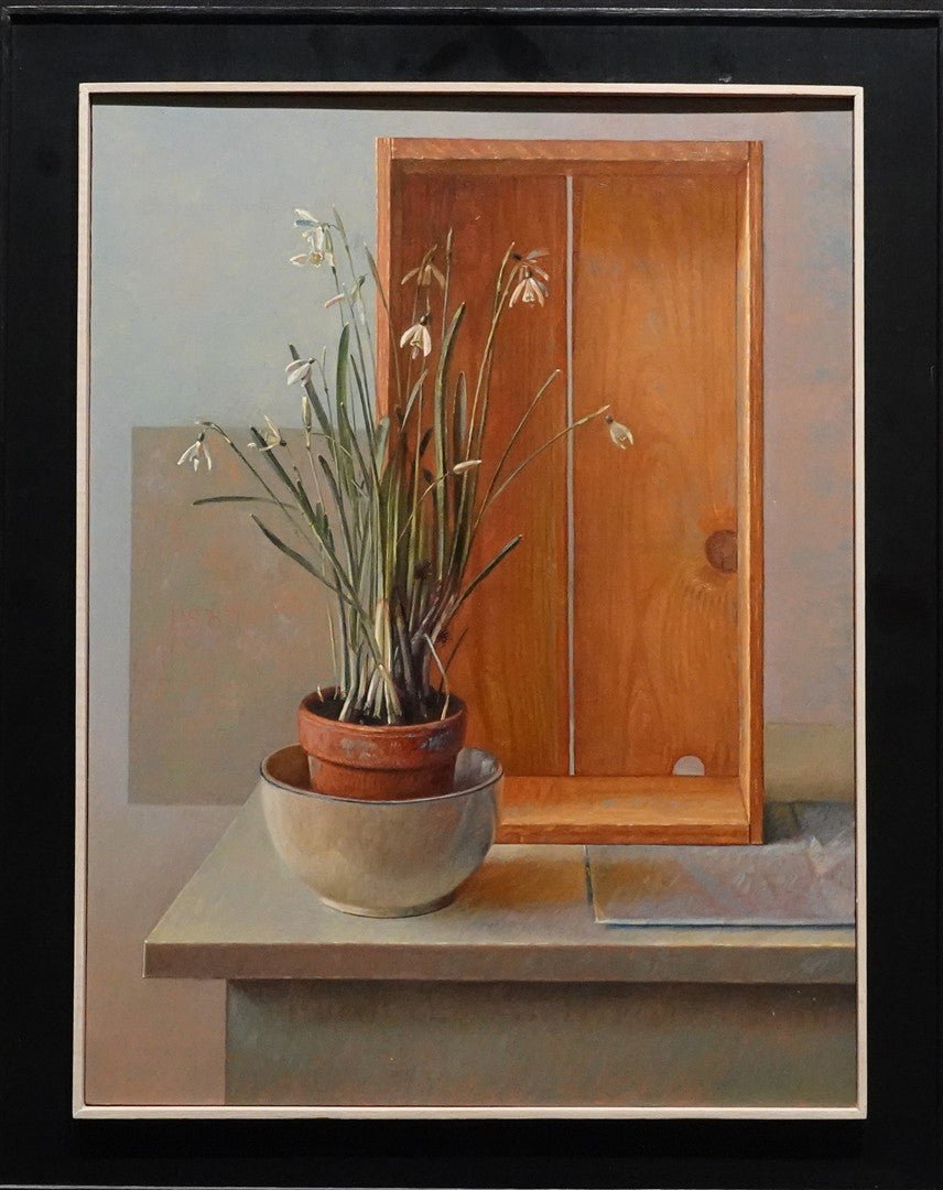 Dit stilleven uit 1987 toont het vakmanschap van Piet Sebens in licht, kleurgebruik en compositie. Het schilderij beeldt sneeuwklokjes af naast een houten kistje, weergegeven met de minutieuze aandacht voor detail die kenmerkend is voor het werk van Sebens. Gesigneerd met initialen P.S. '87. Het schilderij is ingelijst en verkeert in uitstekende staat.