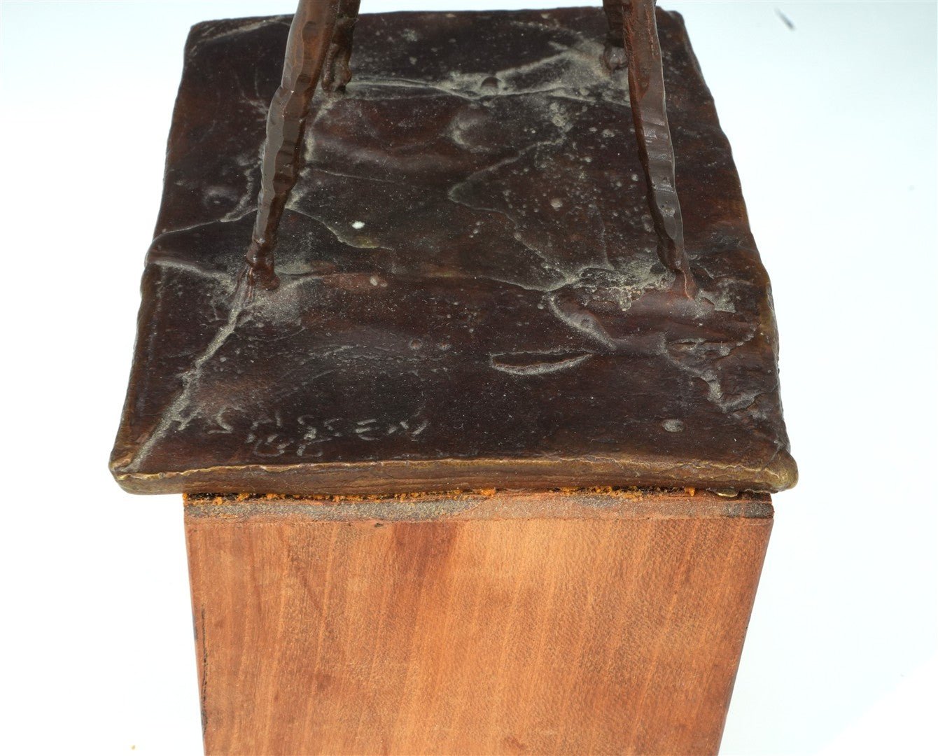A beautifully patinated bronze sculpture of a standing giraffe, created by Amsterdam sculptor Hans Sassen. It stands on a wooden base, 37 cm high.