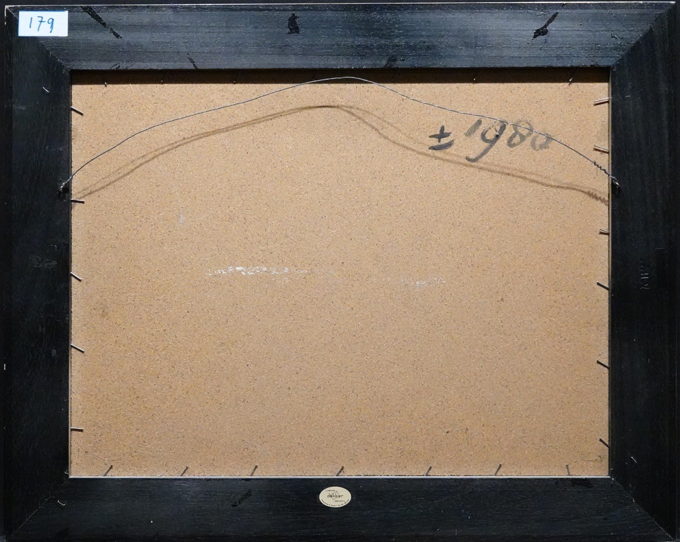 Expressive and colorful work by the Gooi painter Bob ten Hoope. Lady on the Balcony, ca. 1980. Oil on board, 49 x 65 cm.