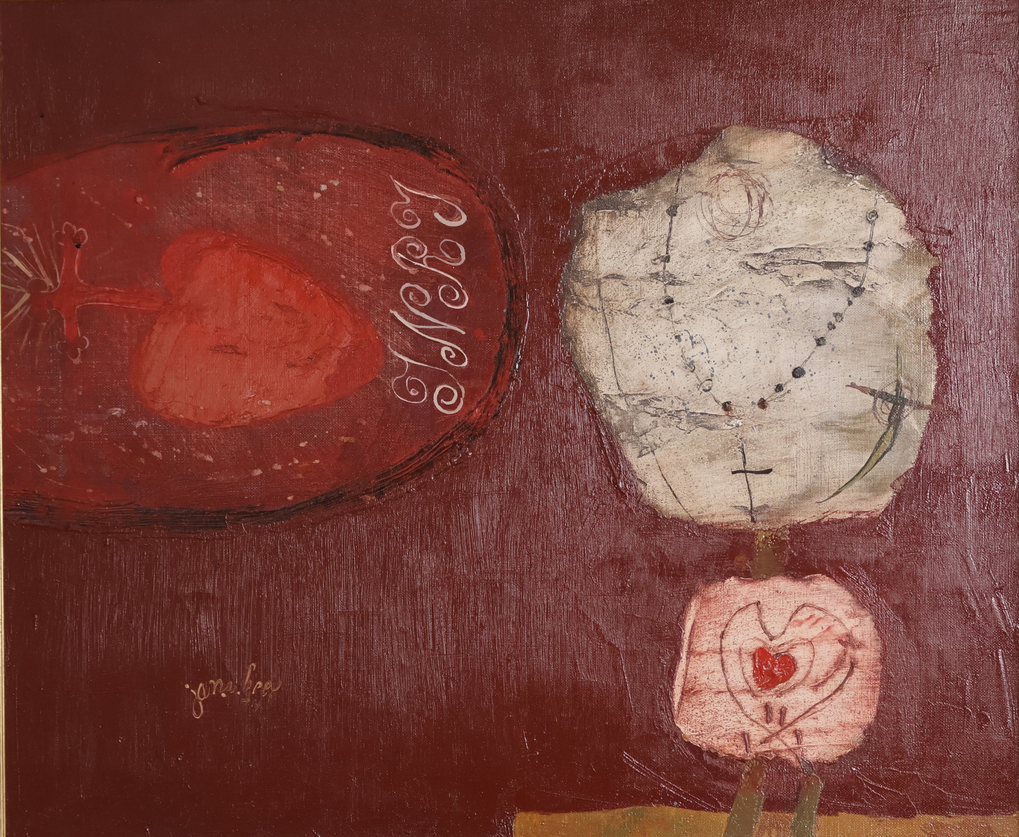 Dit schilderij van Jan van Heel toont een gestileerde paspop-vorm met een ketting. De figuur verschijnt zowel als lichaam en als object. Links is een ovale vorm te zien met daarin een hart en sierlijke symbolen, en onderaan is een tweede, kleiner hart zichtbaar. Van Heel gebruikt warme, aardse kleuren en een gelaagde verfstructuur, waardoor het werk een rustig en enigszins melancholiek karakter krijgt.