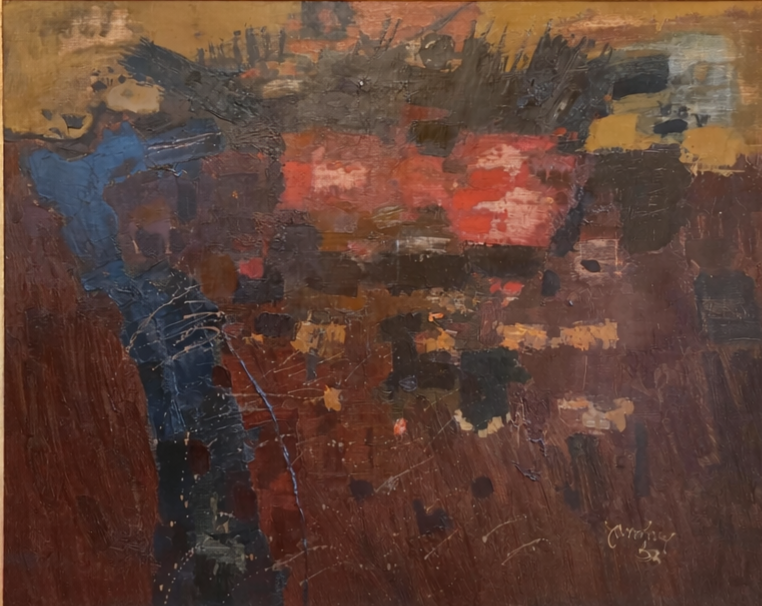 Dit zeer grote abstracte Spaanse landschap van Jan van Heel, Spanje XXX (1963) wordt gekenmerkt door een rijk palet van aardse tinten, waarin oker, diep bruin, zwart en accenten van blauw en rood met elkaar in wisselwerking staan. De warme okertinten in het bovenste veld voegen een gevoel van gloed en ruimtelijke diepte toe.